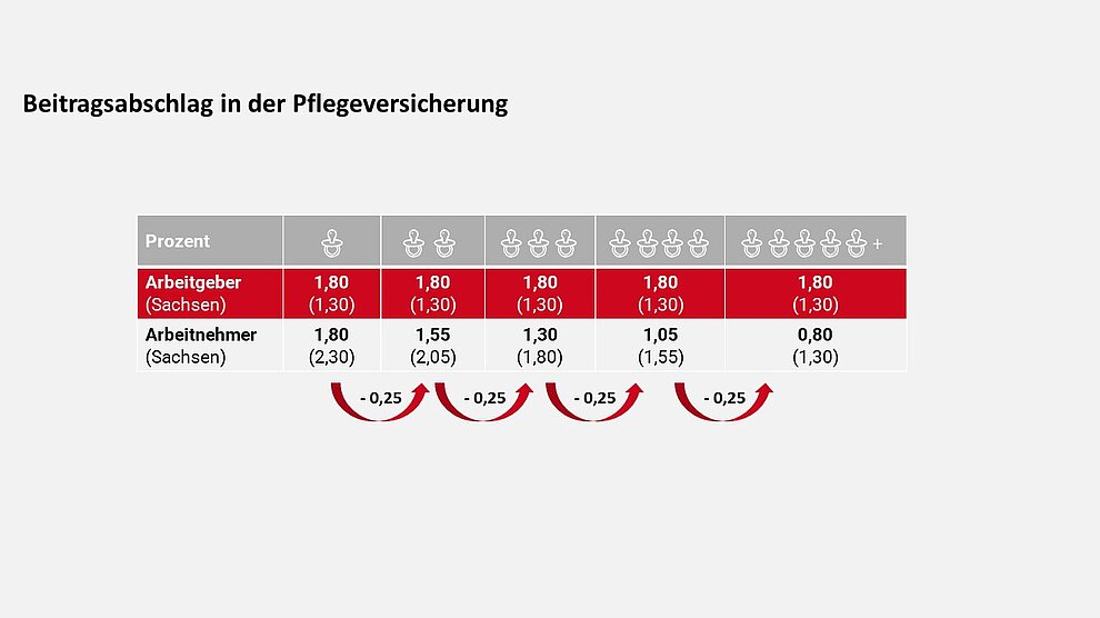 Für Arbeitnehmer mit Elterneigenschaft reduziert sich der Beitragssatz zur Pflegeversicherung für jedes berücksichtigungsfähige Kind ab dem zweiten Kind bis zum fünften Kind um jeweils einen Beitragsabschlag in Höhe von 0,25 Beitragssatzpunkten: